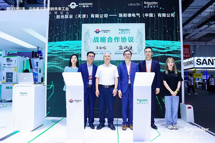 今天,在2023年第23屆中國(guó)國(guó)際工業(yè)博覽會(huì)現(xiàn)場(chǎng),全球能源管理和自動(dòng)化領(lǐng)域的數(shù)字化轉(zhuǎn)型專(zhuān)家施耐德電氣,與陽(yáng)光泵業(yè)(天津)有限公司(以下簡(jiǎn)稱(chēng)“陽(yáng)光泵業(yè)”)達(dá)成戰(zhàn)略合作。憑借在數(shù)字化轉(zhuǎn)型、軟硬件產(chǎn)品、綠色低碳等方面的能力優(yōu)勢(shì)和實(shí)踐經(jīng)驗(yàn),施耐德電氣將助力陽(yáng)光泵業(yè)推動(dòng)數(shù)字化轉(zhuǎn)型及先進(jìn)智能工廠建設(shè),進(jìn)一步提高生產(chǎn)效率與質(zhì)量,優(yōu)化節(jié)能減排及運(yùn)營(yíng)管理能力,引領(lǐng)我國(guó)裝備制造業(yè)走向綠色、智能、先進(jìn)。施耐德電氣高級(jí)副總裁工業(yè)自動(dòng)化業(yè)務(wù)中國(guó)區(qū)負(fù)責(zé)人龐邢健、陽(yáng)光泵業(yè)總經(jīng)理王云龍,代表雙方簽署合作協(xié)議。